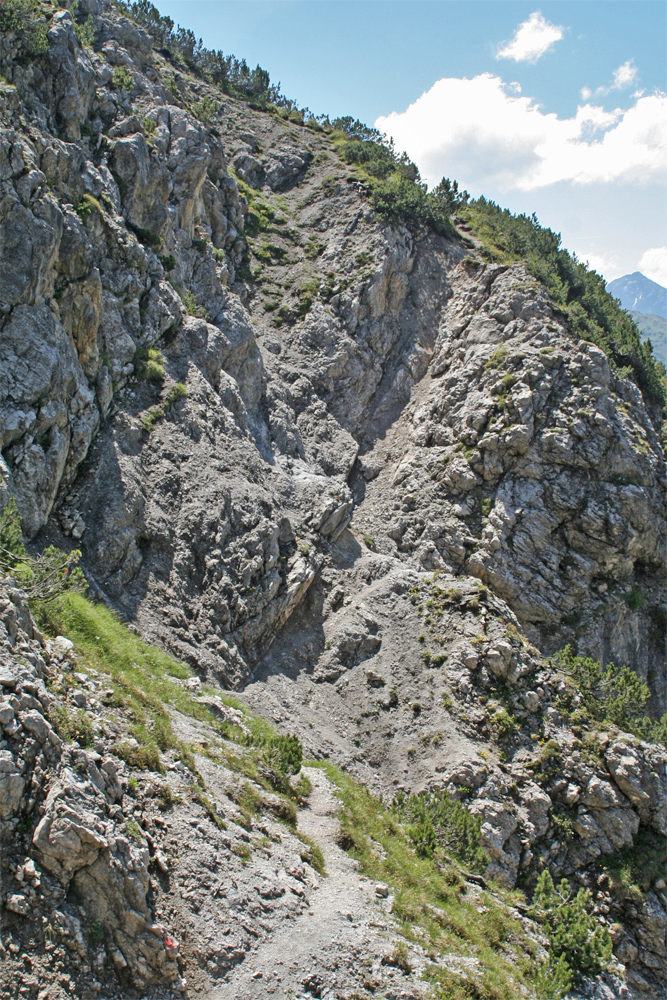 die Schlüsselstelle des Anstieges zur Lichtspitze über den Nordwest-Anstieg (Normalweg) stellen die bröseligen Rinnen und Tobel unterhalb der Nordwest-Flanke des Berges dar
