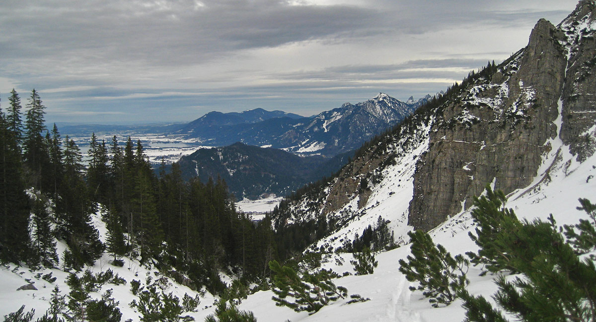Ausblick aus dem Karrettal (Vils) gegen Osten in das Ostallgäuer Alpenvorland, auffällig im Hintergrund rechts der Bildmitte das markante Horn des Geiselsteins in den Ammergauer Alpen