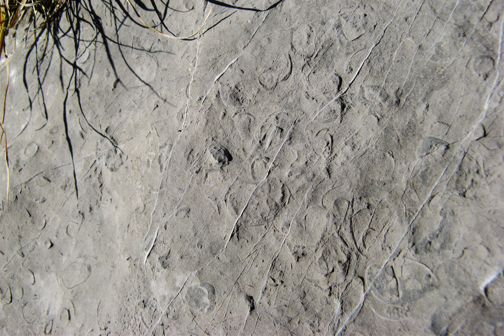 die Verwitterung bringt Muschelschalen im Kalkgestein am Wiesjoch zu Tage
