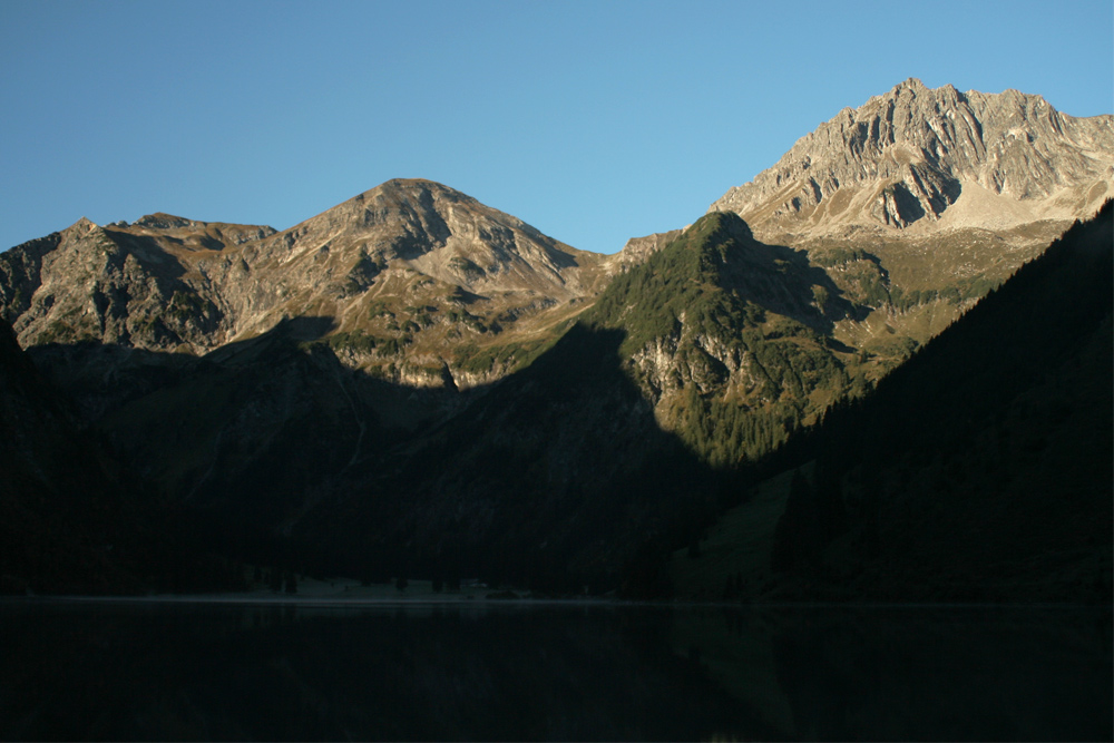 Blick über den Vilsalpsee zum Knappenkopf, dem Kugelhorn und dem zerklüfteten Rauhhorn