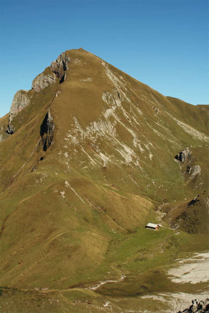 Blick aus dem Bereich Kastenjoch auf die in einem Kessel gelegene Kastenalpe und dem darüber aufragenden Gipfeldach der Roten Spitze
