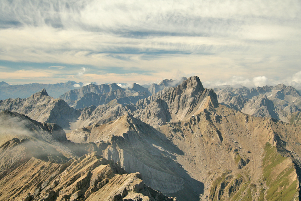 Gipfelblick von dem Imster Muttekopf gegen Südwest zum Bergwerkskopf (li.) und der Großen Schlenkerspitze (Mitte)