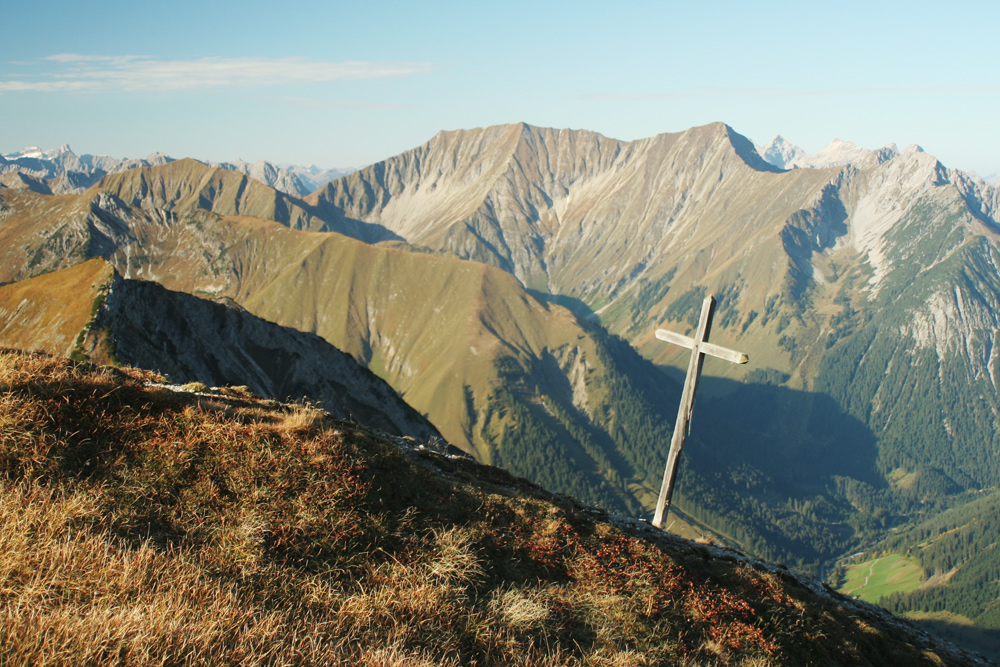 das kleine alte Gipfelkreuz am Sandegg, im Hintergrund der Kreuzspitzkamm mit dem Anhalter Höhenweg