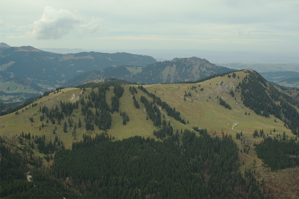 der langgestreckte Gipfelrücken zieht vom Pirschling gegen Norden hin und gipfelt im Schönkahler als höchster Erhebung, dahinter zeigt sich der Gipfelkamm des Sorgschrofen