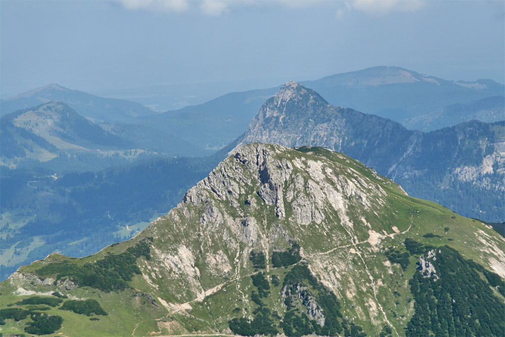 Blick auf die Sulzspitze von Süden, dahinter der Gipfelrücken des Einstein bei Tannheim
