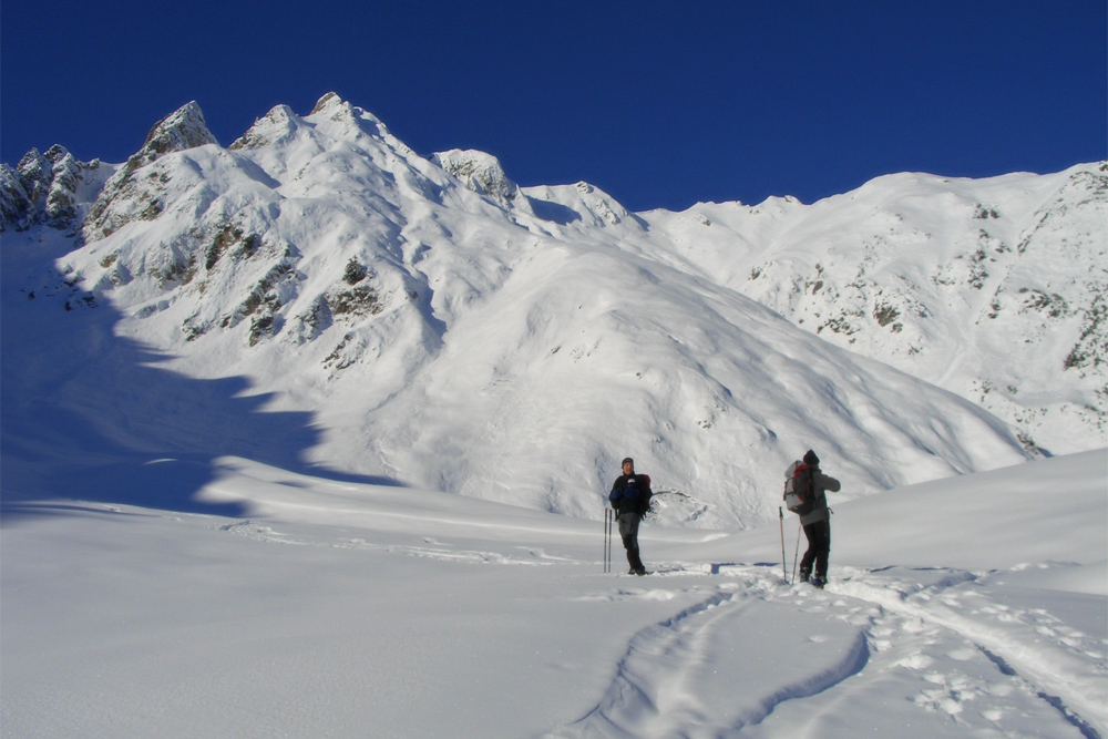 Ausblick vom Gampenboden zu den Zwickspitzen während einer Skitour zum Gampensattel (Gampenjoch)