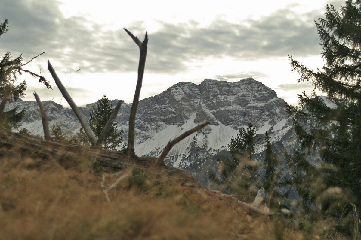 Ausblick vom langgezogenen Rücken des Zwieselberges gegen Süden hin zur Nordwand der Kohlbergspitze