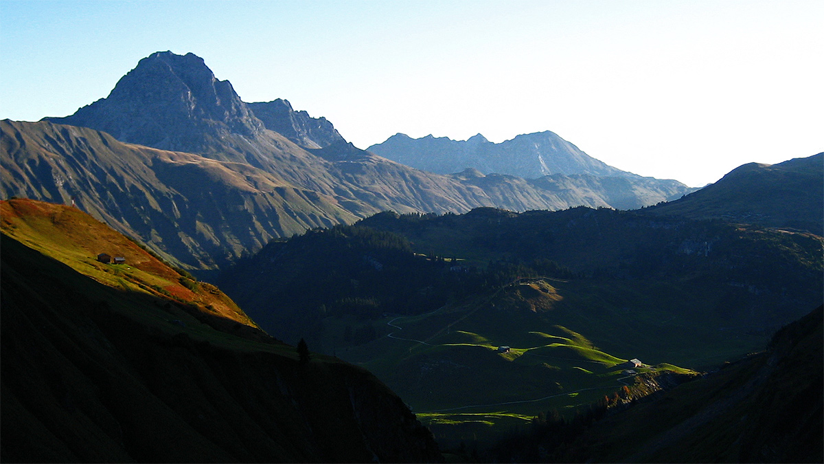 Blick hinab zu der im ersten Sonnenlicht liegenden Unteren Auenfeldalpe, im Hintergrund der Widderstein (li.) und das Walser Geißhorn