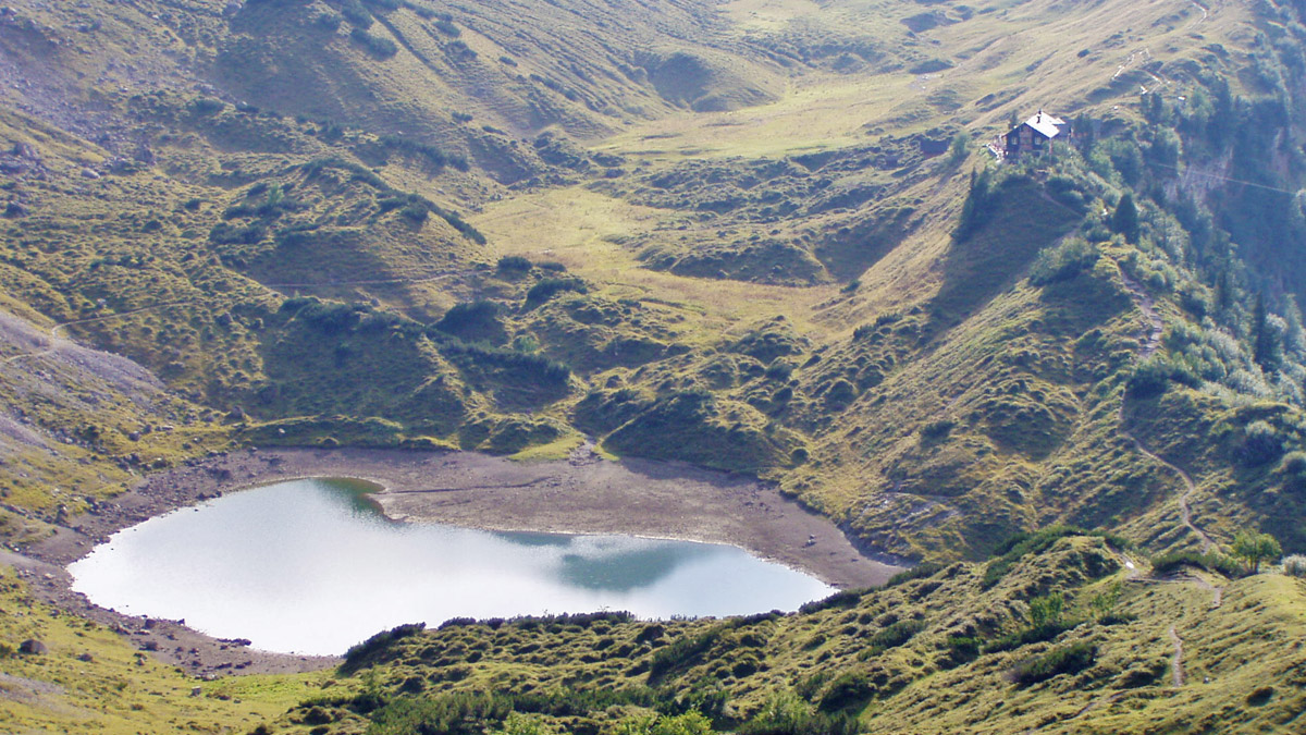 Blick vom östlichen Lachenjoch auf die in einem kleinen Kessel gelegene Lache und der darüber auf einem Felsriegel erbauten Landsberger Hütte