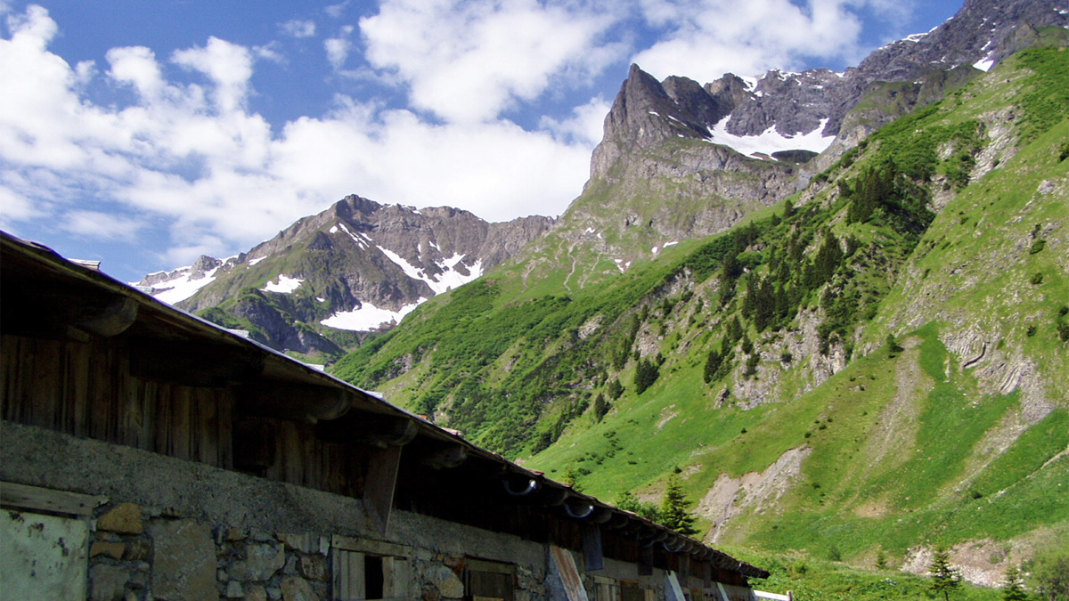 Guflespitze und die sogenannten Vier Festen von der Ronigalpe aus dem Sulzltal gesehen