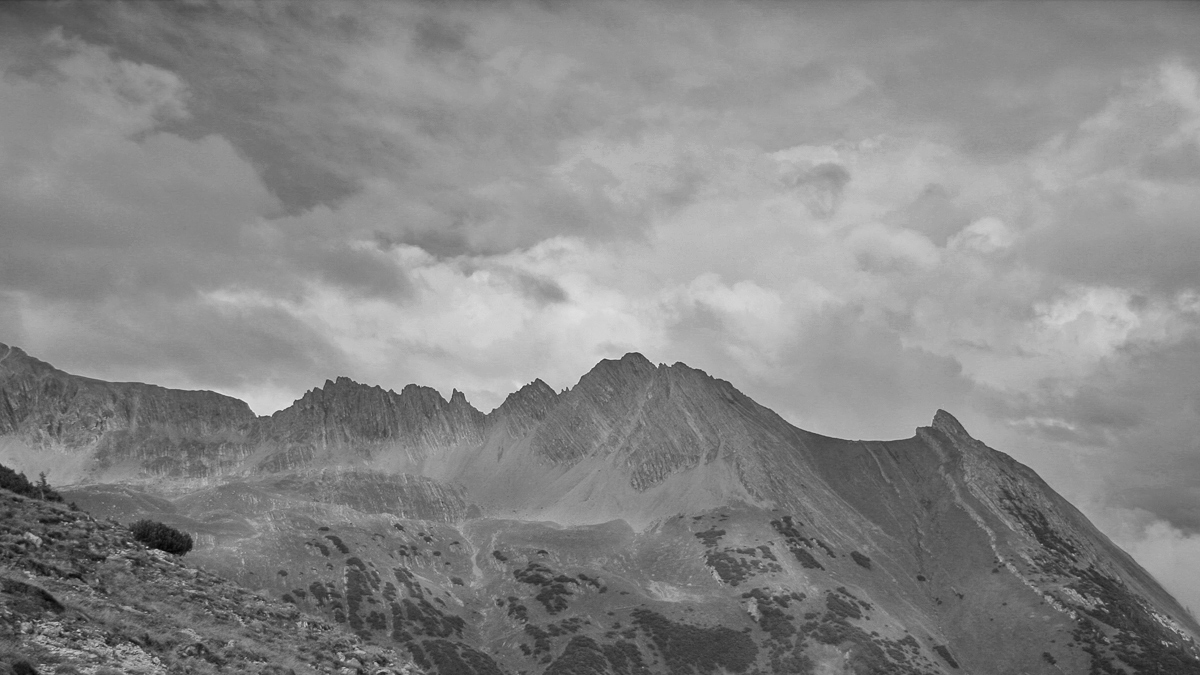 lange zieht sich der zerklüftete von der Kreuzkarspitze herleitende Grat hin zum Söllerkopf, unterbrochen vom Balschtesattel richtet sich davon südlich (re.) die Rotwand auf