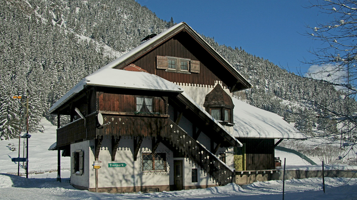 die Südwestansicht des ehemaligen Bahnhofes Bichlbach-Berwang