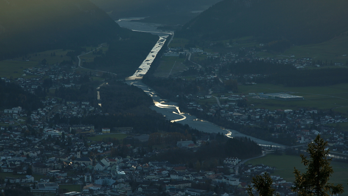 der Lech schimmert im letzten Tageslicht, während er von Weißenbach kommend durch den Reuttener Talkessel fließt