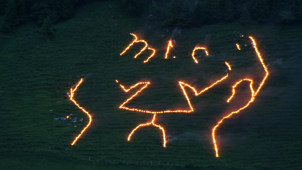 teils werden aufwändige Symbole durch exaktes Einmessen in der Landschaft ausgelegt, wobei auch der Blickwinkel mit einbezogen werden muss um ein perspektivisch ordentliches Ergebnis zu erreichen