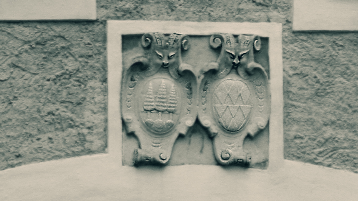 der Wappenstein am Durchfahrtstor der Ehrenberger Klause - die drei Tannen waren schon von alters her das Gerichtswappen von Ehrenberg, daneben das Wappen des Pflegers von Ehrenberg Burkhard Laymann zu Liebenau