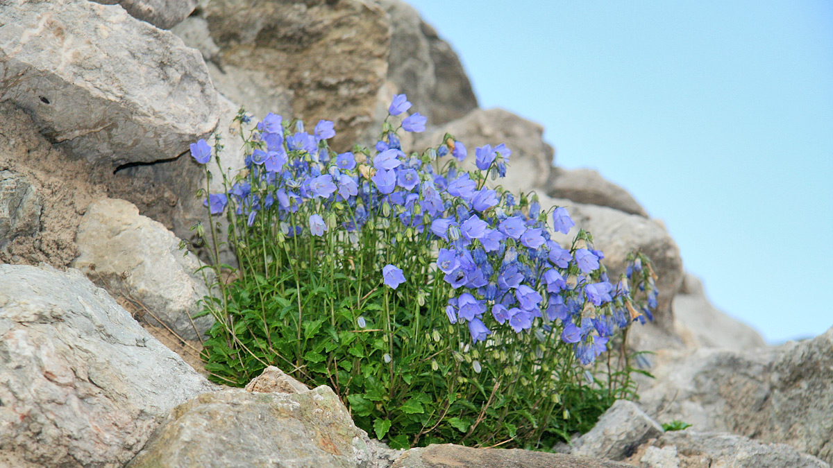 eine Gruppe Glockenblumen hat sich in den Mauerresten der Burgruine Hohenfreyberg angesiedelt