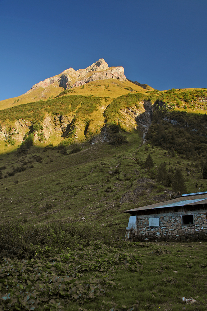 Ausblick von der Ronigalpe hinauf zu der steil aufragenden Tajaspitze