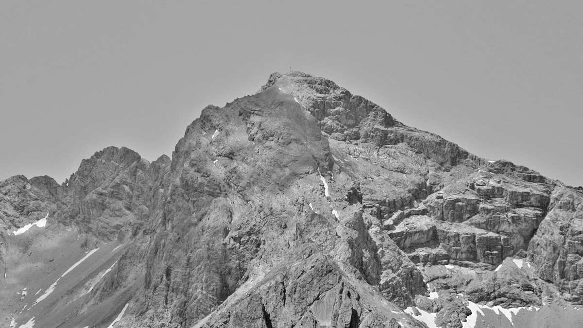 die Bretterspitze in der Ansicht aus Südost - quer durch den rechten Wandfuß leitet ein auffälliger Felssims als Enzensberger Weg in den oberen Bereich der Schwärzerscharte hinaus