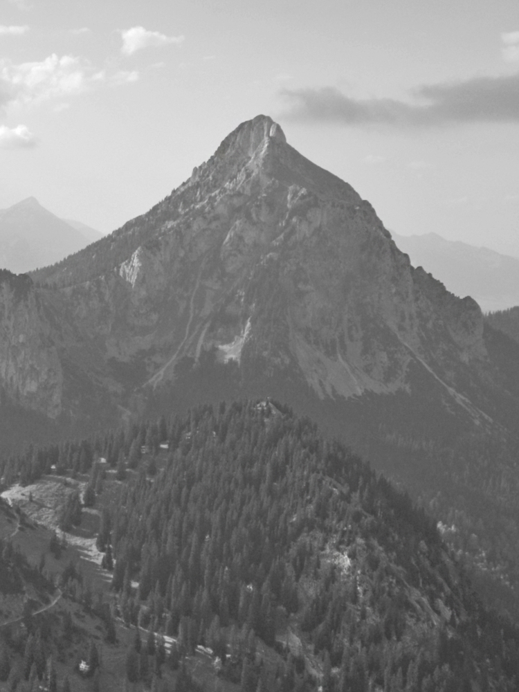 der Säuling als imposanter Felskegel vor dem fast zur Gänze bewaldeten Schlagstein