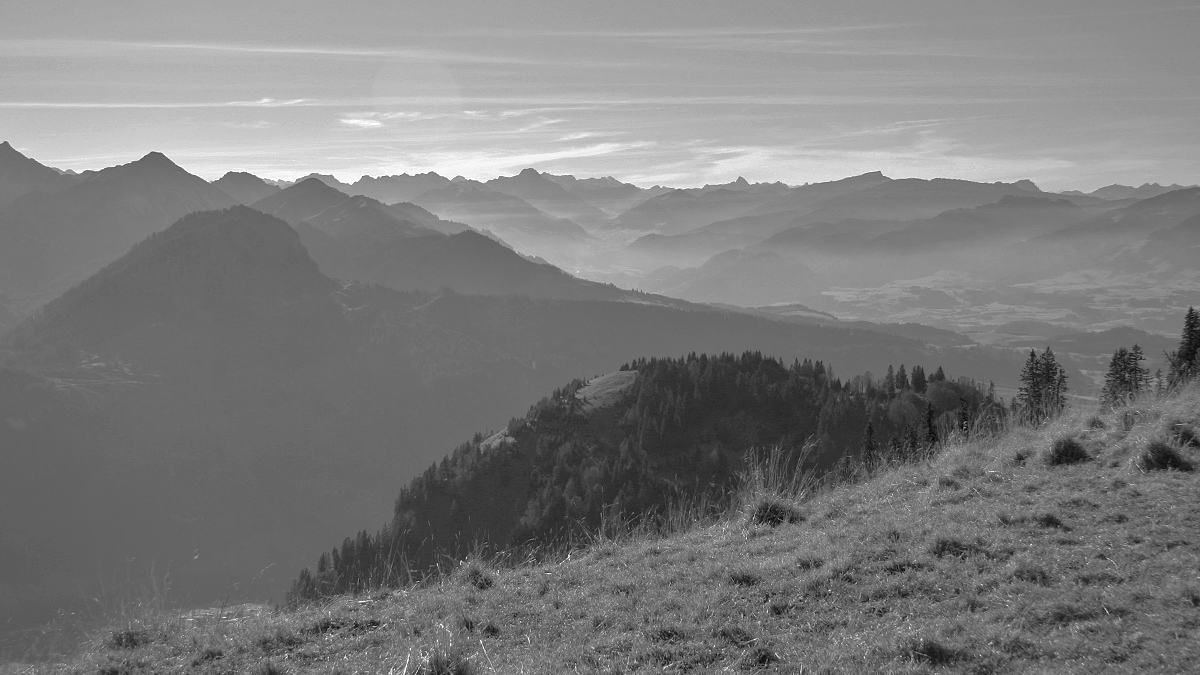 Gipfelblick vom Spieser hinab zum Kleinen Hirschberg und in das Illertal - eingerahmt von den Allgäuer Alpen