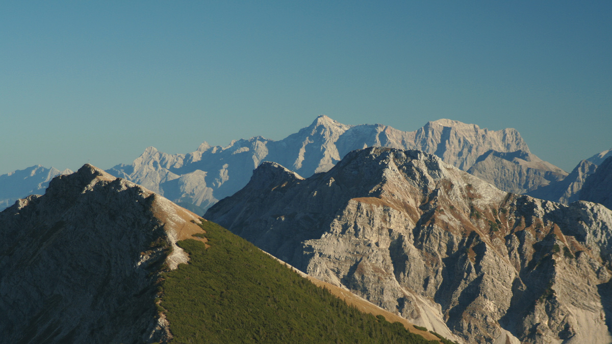 links das Brentenjoch und rechts der Mitte die Große Schlicke - im Hintergrund das Wettersteinmassiv