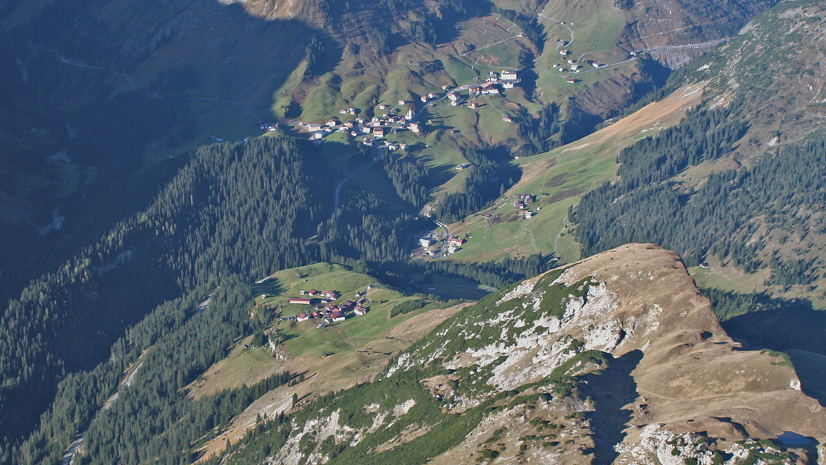 die durch die Walser geprägten Ansiedlungen im obersten Lechtal - Lechleiten auf dem Plateau des westlichen Ausläufers des Biberkopfes, dem Hundskopf, und das weiter unten im Tal gelegene Gehren - über dem Tobel des Krumbaches die Gemeinde Warth auf Vorarlberger Seite