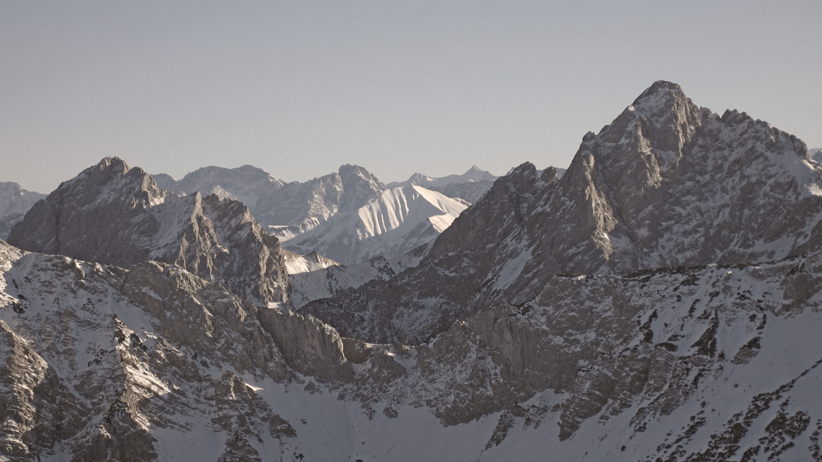 beim Blick vom Brentenjoch durch die Vilser Scharte hindurch fallen speziell die (v.l.) Gehrenspitze, der Wamperte Schrofen, die Pleisspitze (Bleispitze, Mähberg) und die Köllenspitze ins Auge