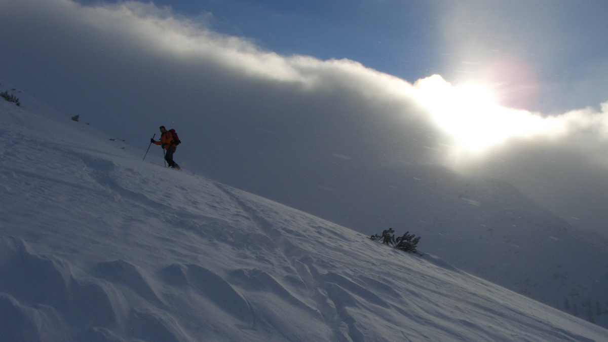 beim Aufstieg am Egg entlang des Engelspitz-Westrückens treibt der starke Wind den Schnee über den Geländekamm