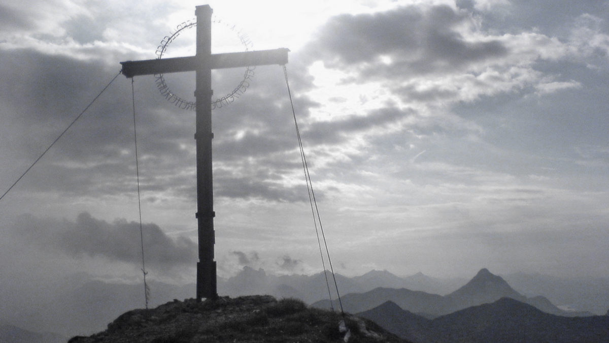 Gipfelkreuz des Westlichen Geierkopfes - als Silhouette zeichnen sich die Tannheimer Berge und der markante Säuling ab