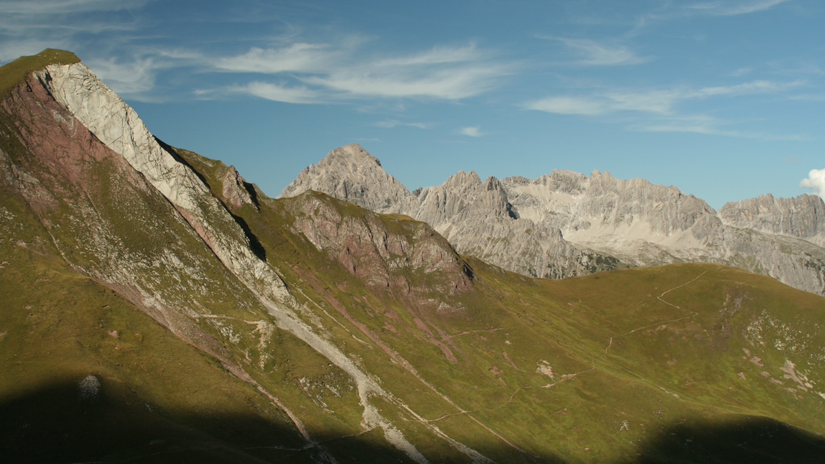 die auffällige Rothornspitze durch deren Südflanke der Lechtaler Panoramaweg auf die Mutte hinaufführt