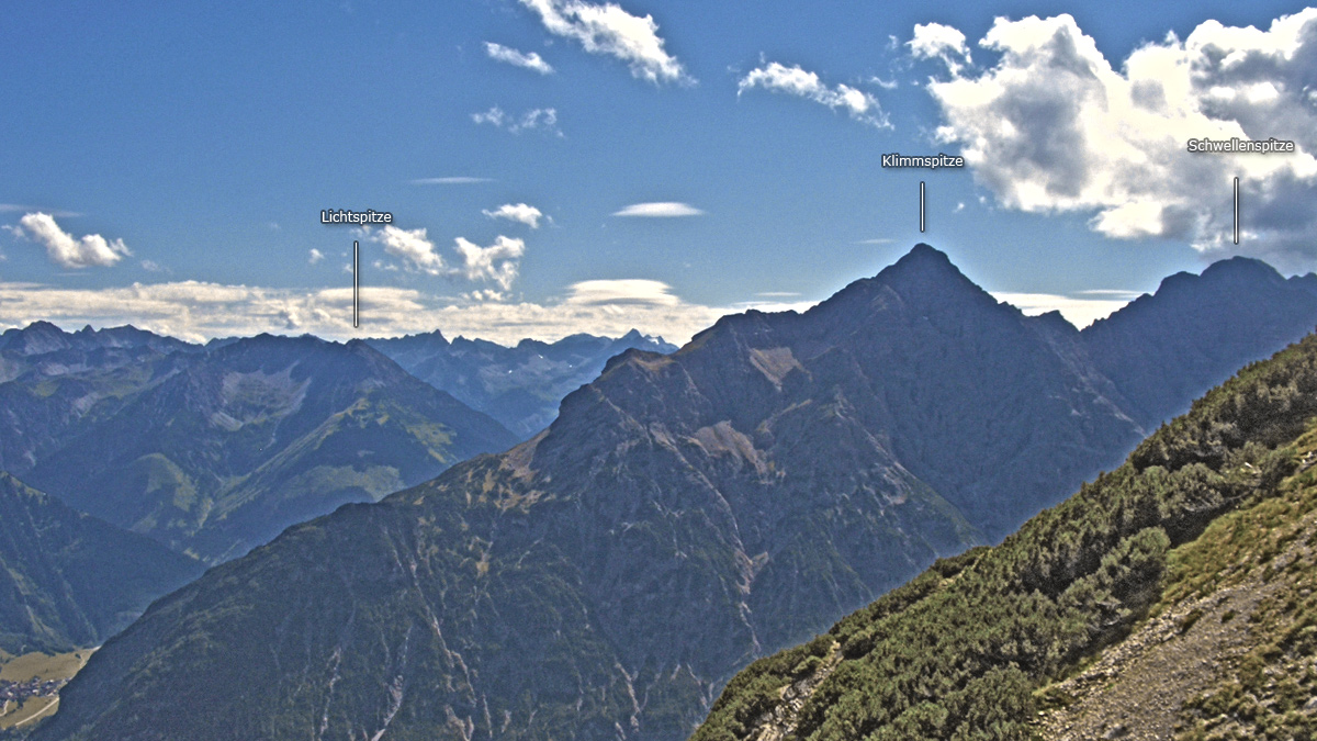 die Klimmspitze bildet den östlichen Abschluss der Hornbachkette - gefolgt von der Schwellenspitze - auf der gegenüberliegenden Talseite fällt die Lichtspitze ins Auge