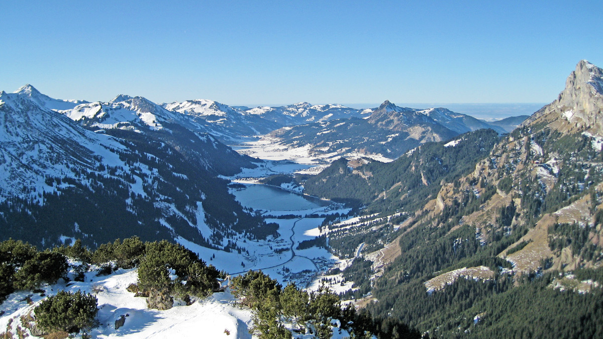 Gipfelblick vom Reuttener Hahnenkamm gegen Westen in das Tannheimer Tal