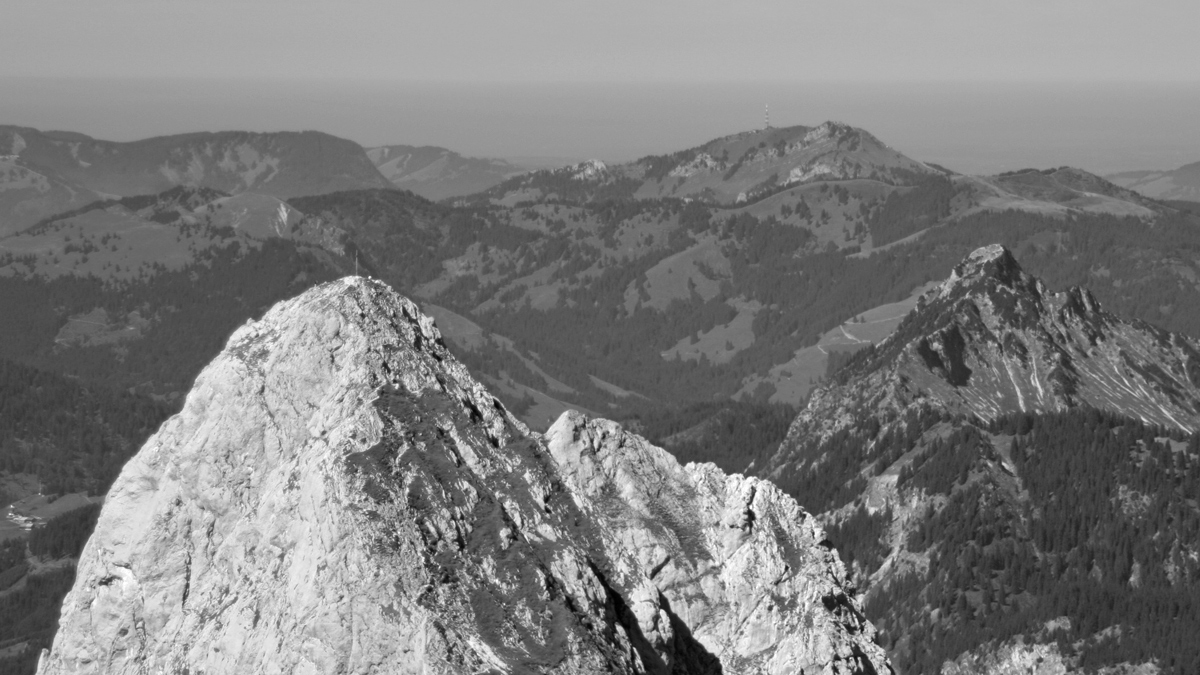 der Gimpel von Osten, der benachbarten Köllenspitze aus gesehen - rechts dahinter der Einstein bei Tannheim