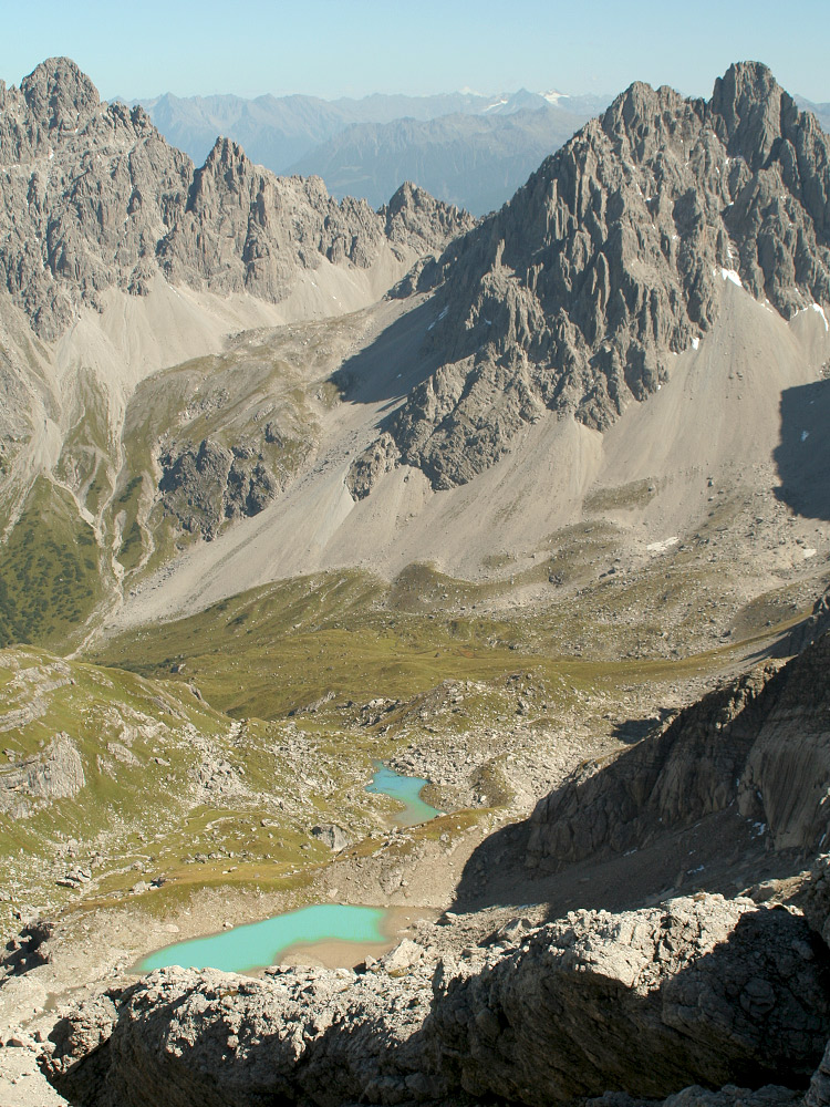 die Parzinnseen im weitläufigen Gebiet des Parzinn - im Hintergrund die Kleine Schlenkerspitze (li.) und die Dremelspitze