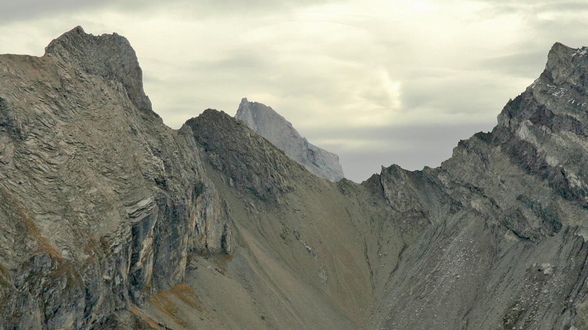 über der Scharte zwischen Etlerkopf (li.) und dem Nordgrat der Holzgauer Wetterspitze schaut noch der Gipfel der Freispitze herüber
