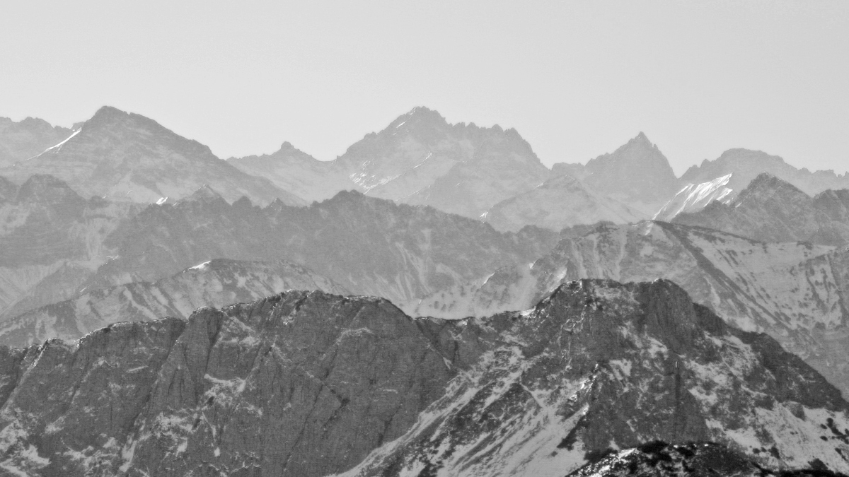 hinter der Gaichtspitze staffeln sich die Lechtaler Alpen - ganz im Hintergrund (v.l.) die Namloser Wetterspitze, die bedeutend kleinere Brunnkarspitze, die überragende Große Schlenkerspitze und die schroffe Dremelspitze