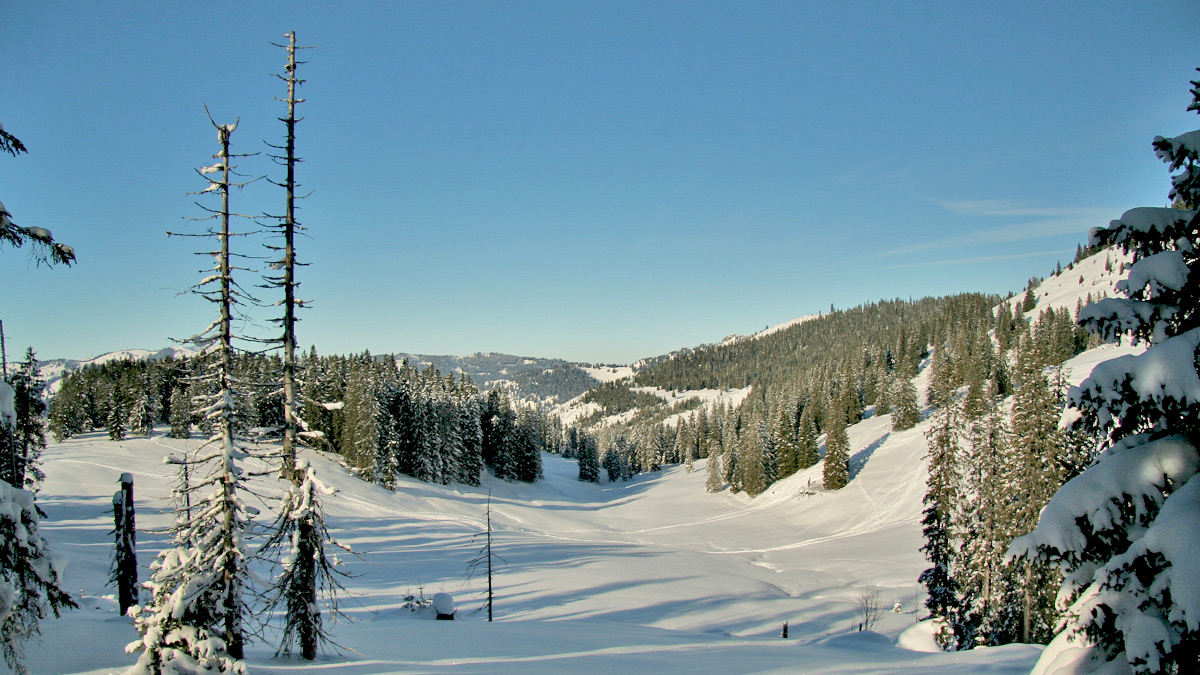 im alten Hof sammelt sich das Wasser des Steinigen Bachs - im Hintergrund der Höhenzug am Starzlachberg (Riederberg) bei Unterjoch