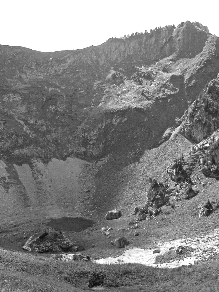 unterhalb des Vorderscheinbergs bildet eine riesige Doline einen weiträumigen Kessel aus