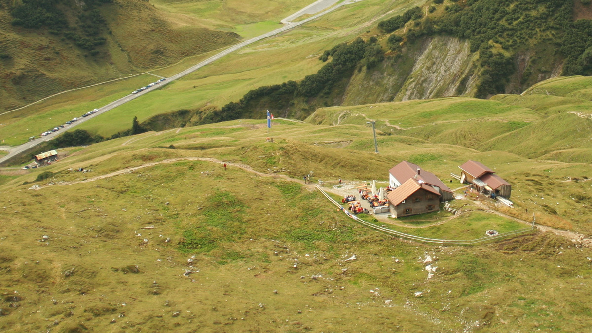 Gipfelblick vom Leopoldshörnle hinab auf die Widdersteinhütte - nur etwas mehr als 300 Höhenmeter über dem Hochtannbergpass