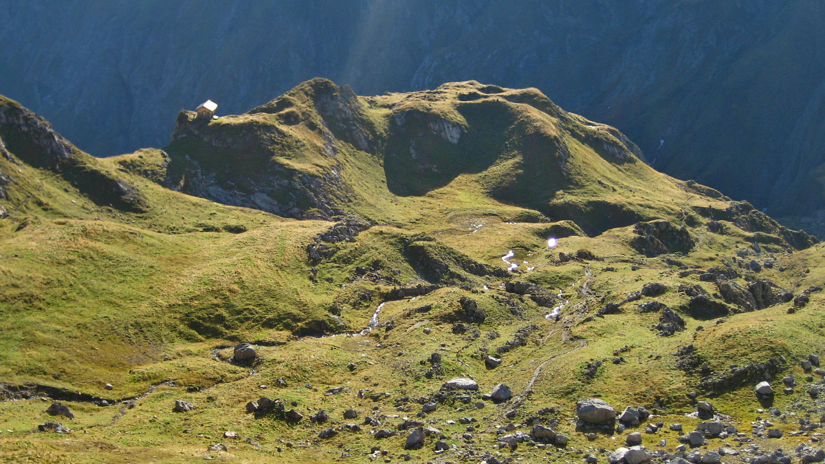 die prominent gelegene Jagdhütte am Rand der Hochgletscheralpe
