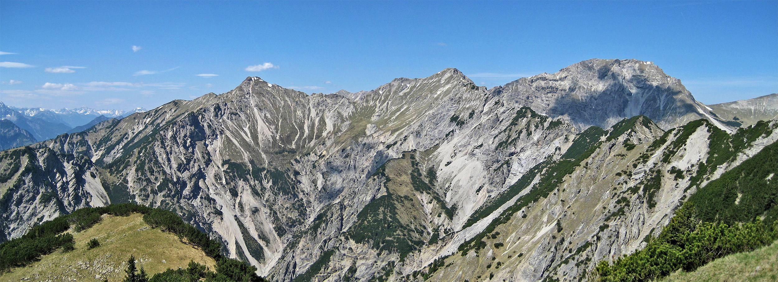 die Schellschlicht (li.) entsendet ihren Grat nach Norden zum Kreuzspitzl und weiter zur Kreuzspitze - der vom Kreuzspitzl in den Vordergrund verlaufende Grat des Friederjoches gilt bergsteigerisch als anspruchsvoll