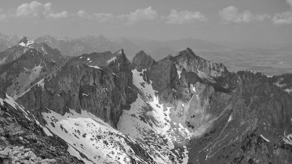 Gipfelblick von der Hochplatte hin zu Krähe und Gabelschrofen (Bildmitte) - rechts dahinter der Branderschrofen am Tegelberg
