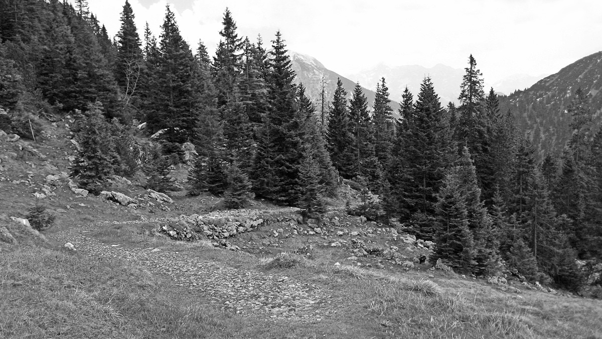 aus der Zeit des alpinen Bergbaus im Gebiet des Straußbergsattels und des Schwangauer Kessels hat sich der recht breite Transportweg erhalten