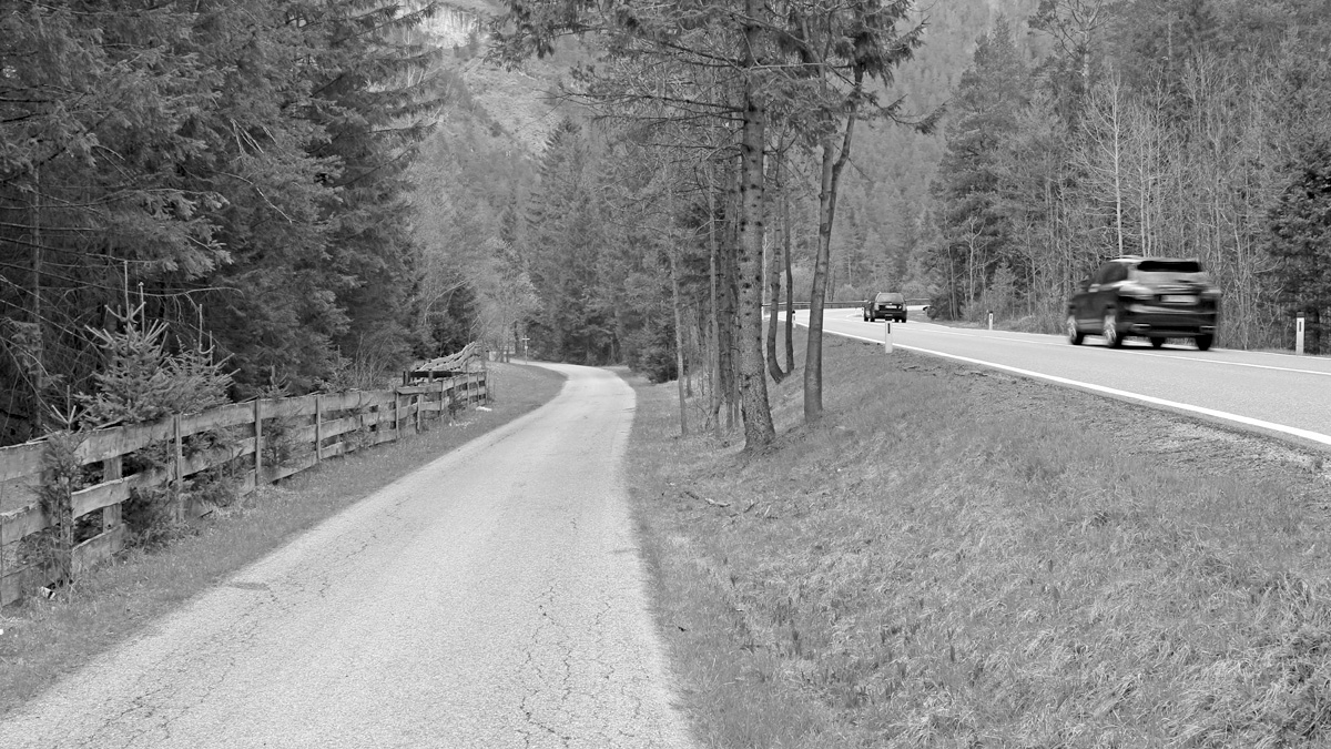 drei Straßenvarianten auf einem Bild - die linke Trasse wurde bereits in römischer Zeit genutzt und diente auch als Salzstraße - rechts die heutige Fahrbahn