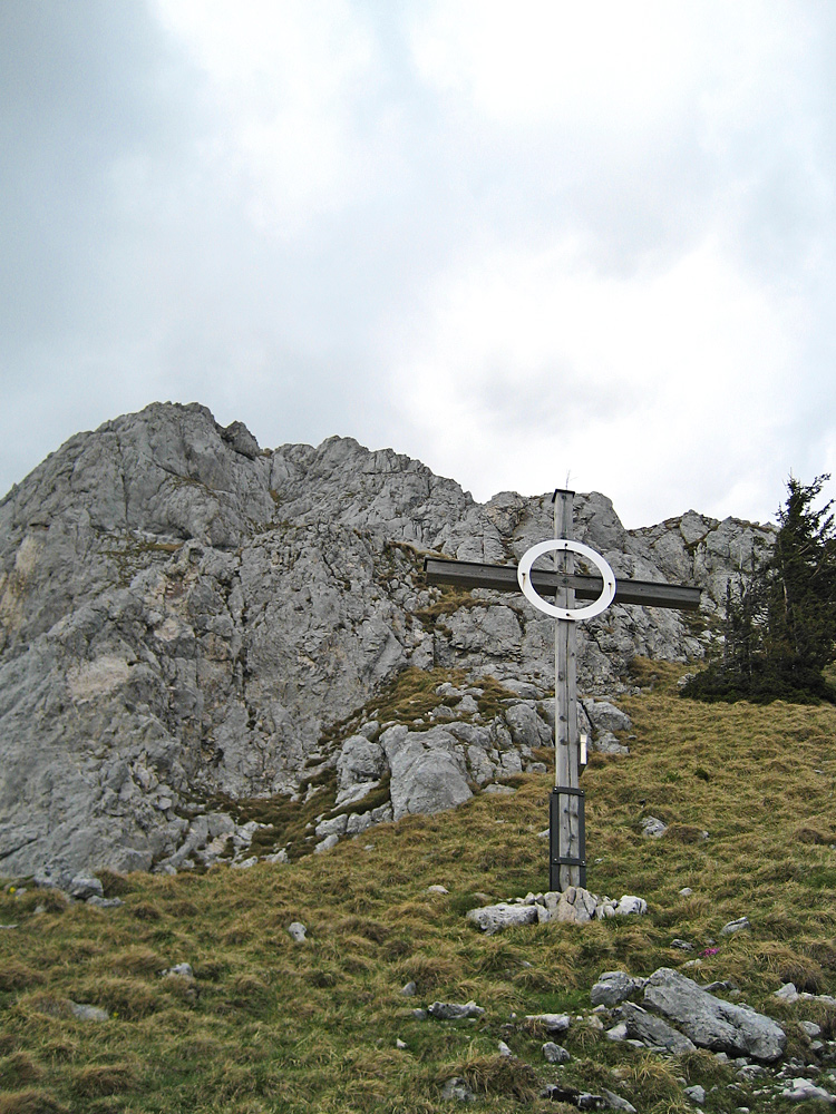 das Gipfelkreuz am Kleinen Säuling - darüber die Südwestkante des 'Großen' Säulings