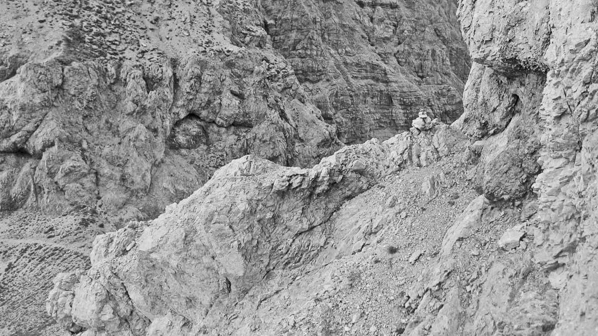 hin und wieder markieren Steinmänner die Trittspuren und Kletterpassagen (etwa I+) hinab in die Einschartung am Kreuzspitzgrat