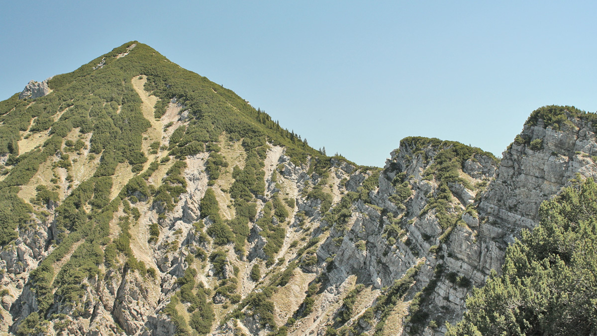 Ausblick vom Spieß gegen Osten zum Lichtbrenntjoch - auf halber Höhe zieht der Steig von der Sacktalscharte durch die Latschenfelder