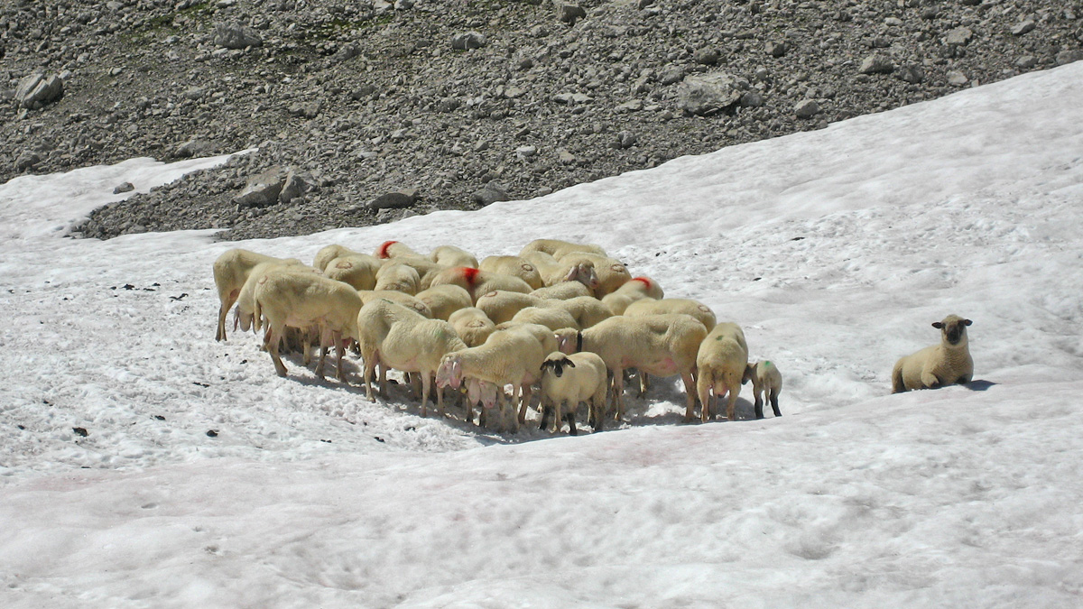 die Schafe nutzen die Altschneereste zur Abkühlung