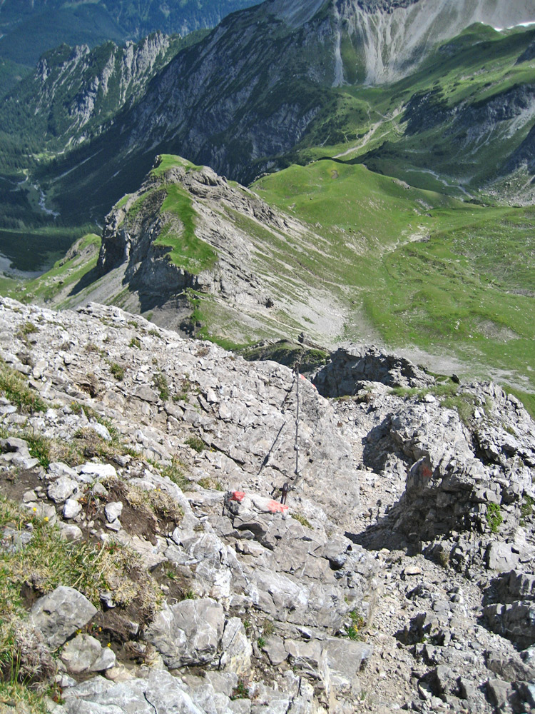 seilgesichert geht es die letzten Meter über den Südsteig hinauf zum Gipfel des Roten Steins