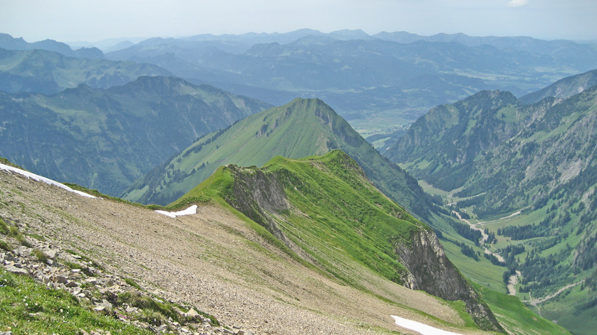 vom Kreuzeck führt ein Steig über den Bettlerrücken hinab ins (hier nicht sichtbare) Traufbachtal - in der Gratverlängerung erheben sich die Kegelköpfe